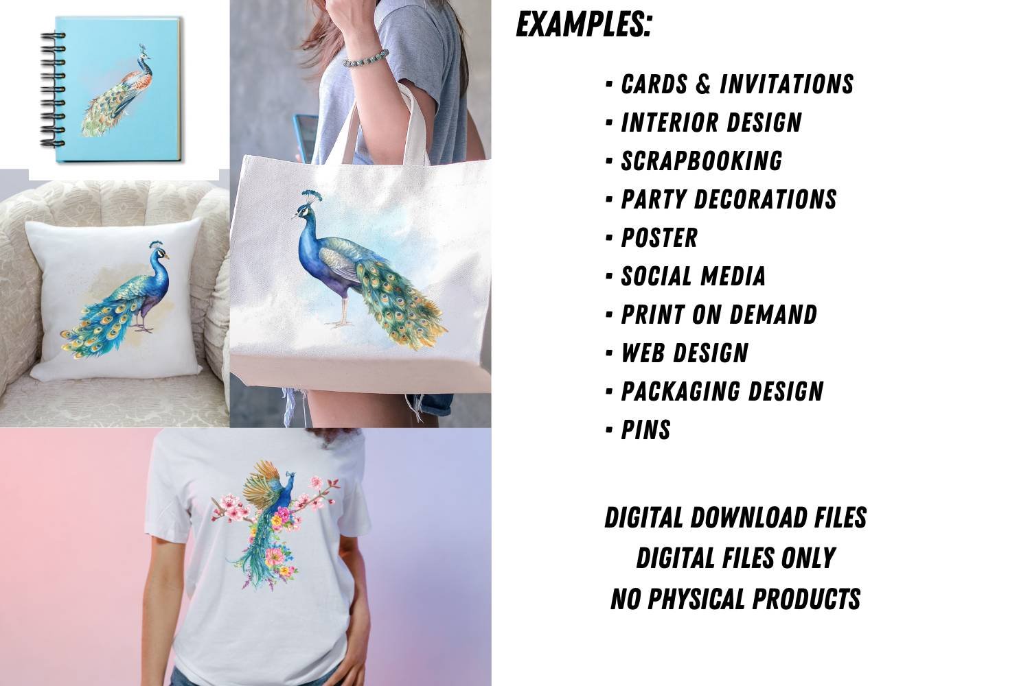 Watercolor Peacock Clipart are the great choice for Greeting cards, birthday cards, wall art, baby Shower card, Personal Planners, scrapbooking, Personal party designs, Printable, website design, mug, Tea Towels, Vinyl Decals, Pillow Covers, Notebook, covers, Party Decor / Favors, Gift tag and many more DIY projects. and will allow you to inject a bit of sophistication and down-to-earth atmosphere in your creative work.