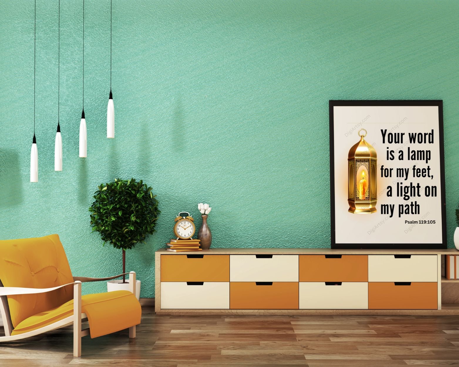 This is a beautiful Bible verse wall art print, Your Word is a lamp for my feet, a light on my path. Psalm 119:105 which goes very well in the room and adds a color to your walls. It reflects vintage, retro and minimalist style and serves as a perfect decorative piece for entryway, living room, bedroom, kitchen, bathroom, dorm etc.