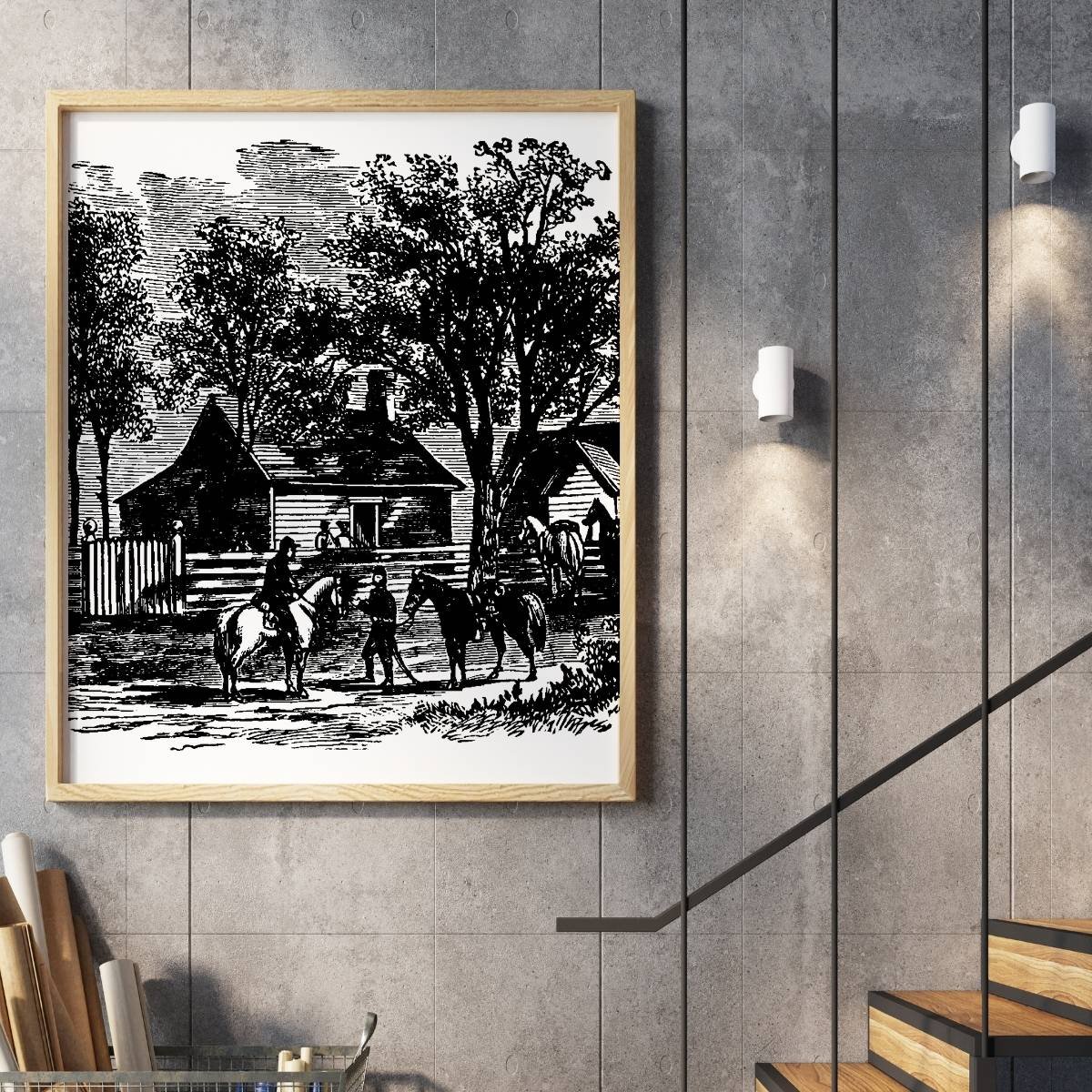 Enhance the quality of your space with Cowboys on Horses Sketch Print Western Wall Art of country landscape Print. A Vintage sketch that adds an elegant touch of class to any room whilst keeping to a neutral colour theme. This is something you can decorate and feature as an accent to add to some eclectic gallery wall, a small print sitting on a shelf, counter or as a large-scale statement wall piece. A great vintage art sketch drawing for your gallery wall decor!