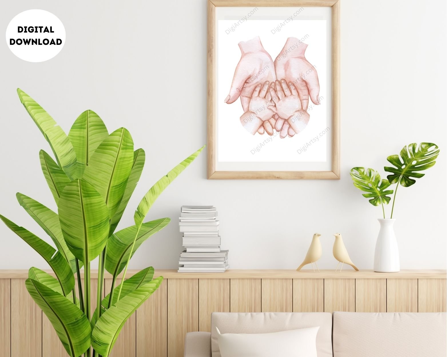 Celebrate the beauty of Family with this Family Holding Hands Wall Art featuring a handprint of a family with one kid. Perfect for adding a touch of warmth and elegance to any room, this printable Family wall art is designed in a simple yet sophisticated style. Ideal for modern or minimalist decor, this watercolor family handprint design will complement any space, from nurseries to living rooms.