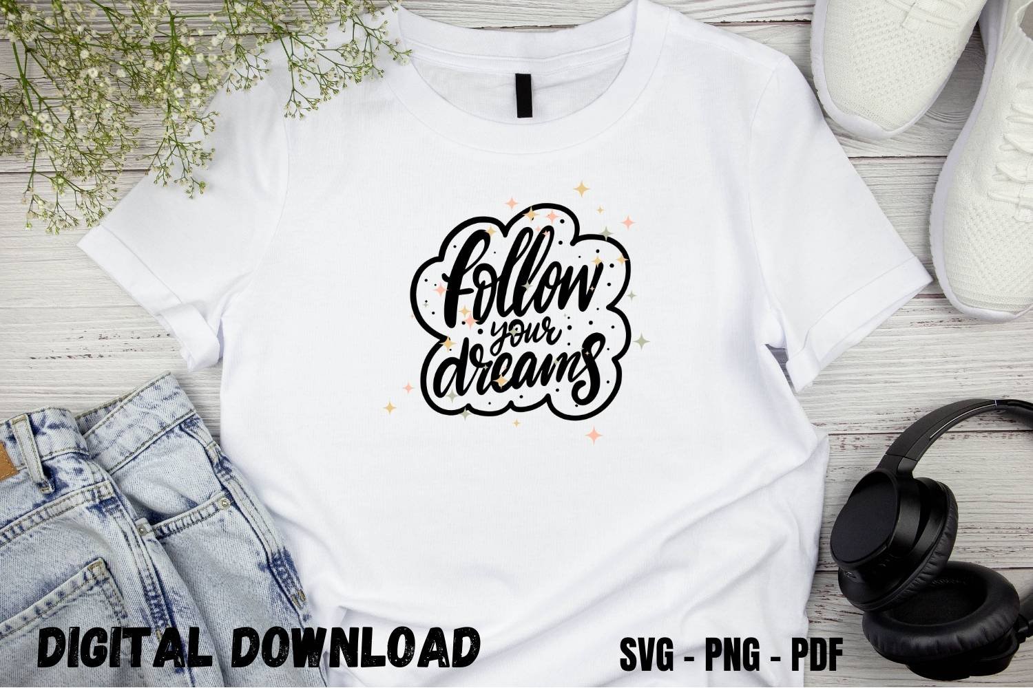 This Follow Your Dreams Motivational T-shirt Design Print contains 4 files in total