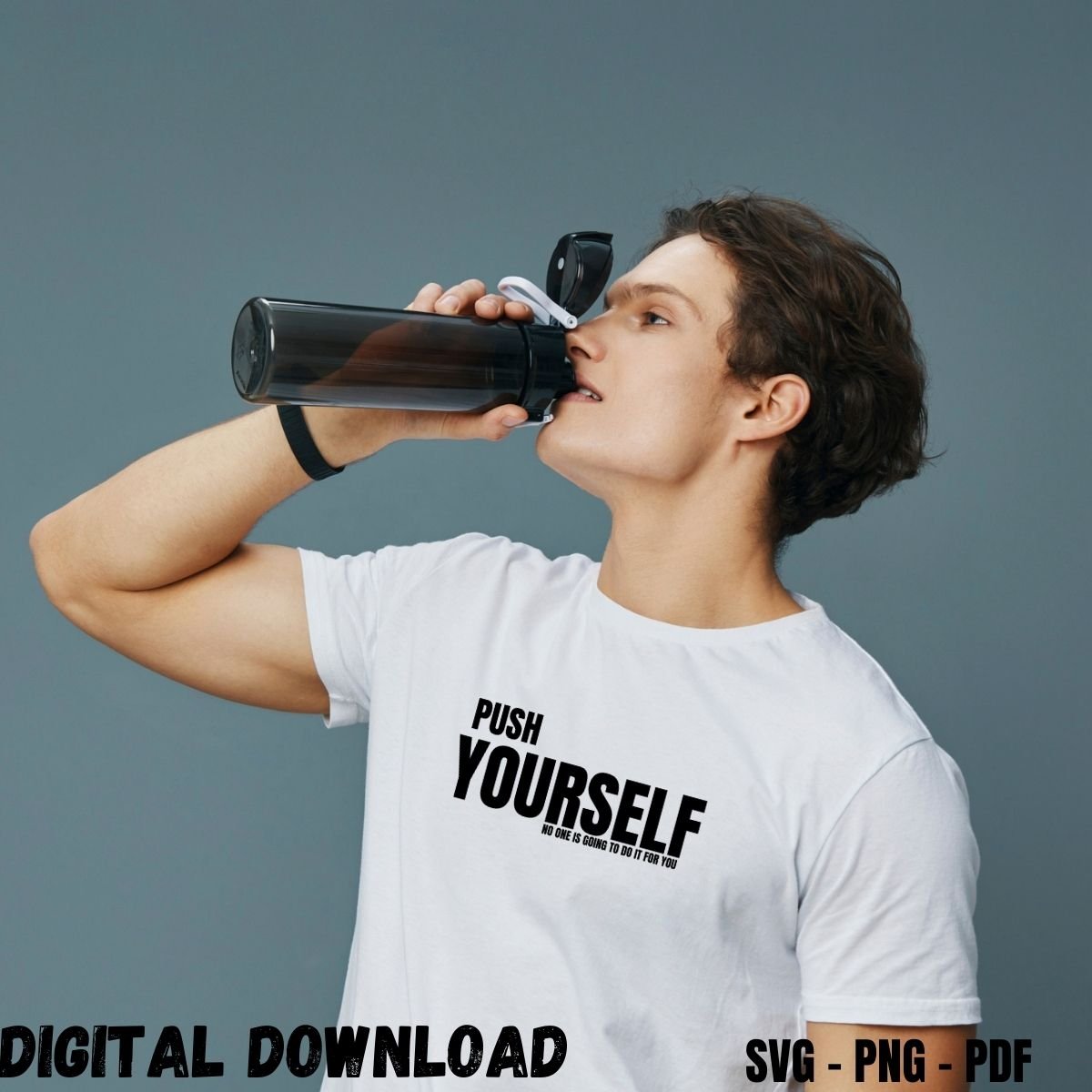 Unleash your inner strength and love of fitness with this bold Gym Quotes T-shirt Print Push Yourself! Ideal For Gym Lovers, Bodybuilders, Sportsman, Or Anyone Who is Serious about Gym and fitness, this design pack includes a high-resolution Transparent PNG file (no Background). Design your own personalized gym T-shirts, tank tops, gym bags or workout gear and let your fitness goals do the talking!
