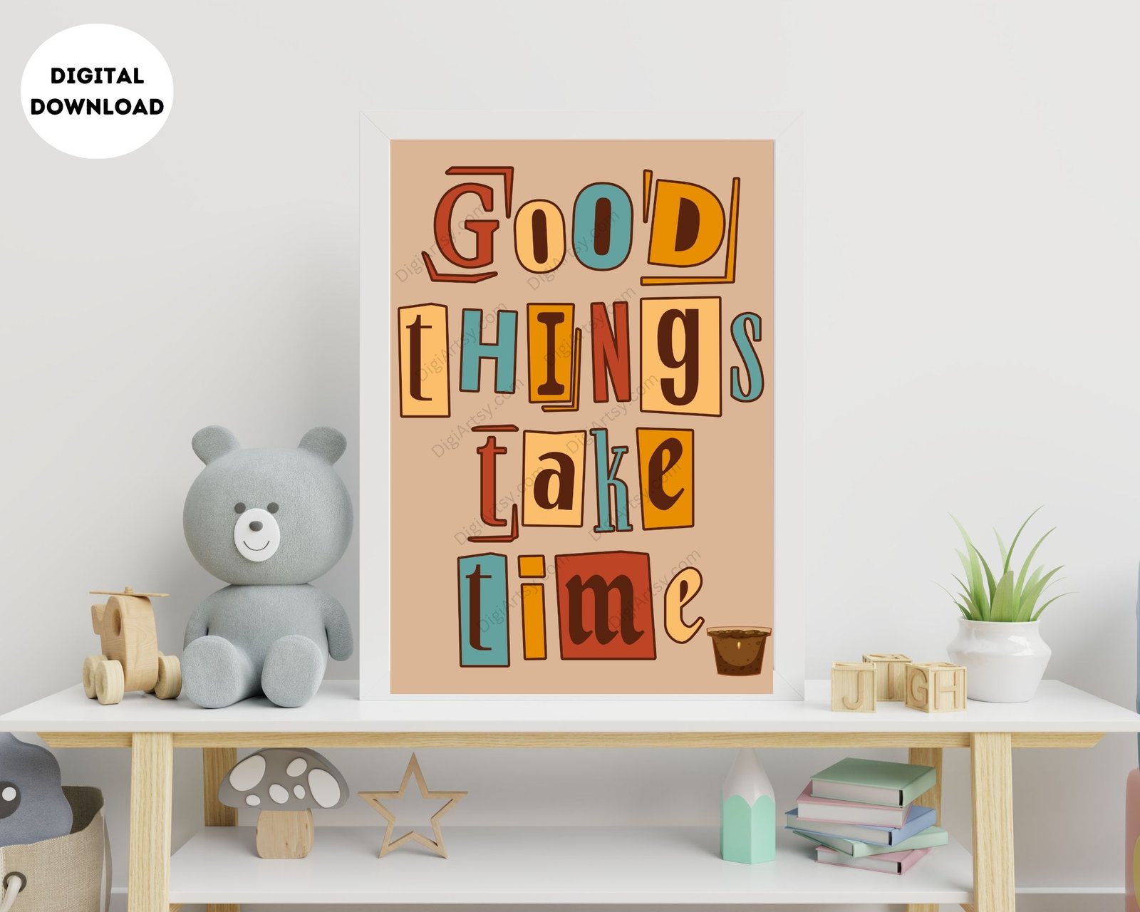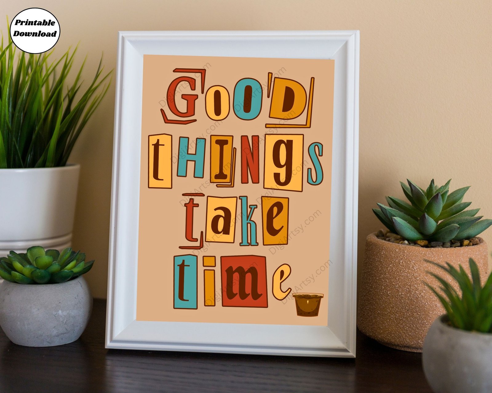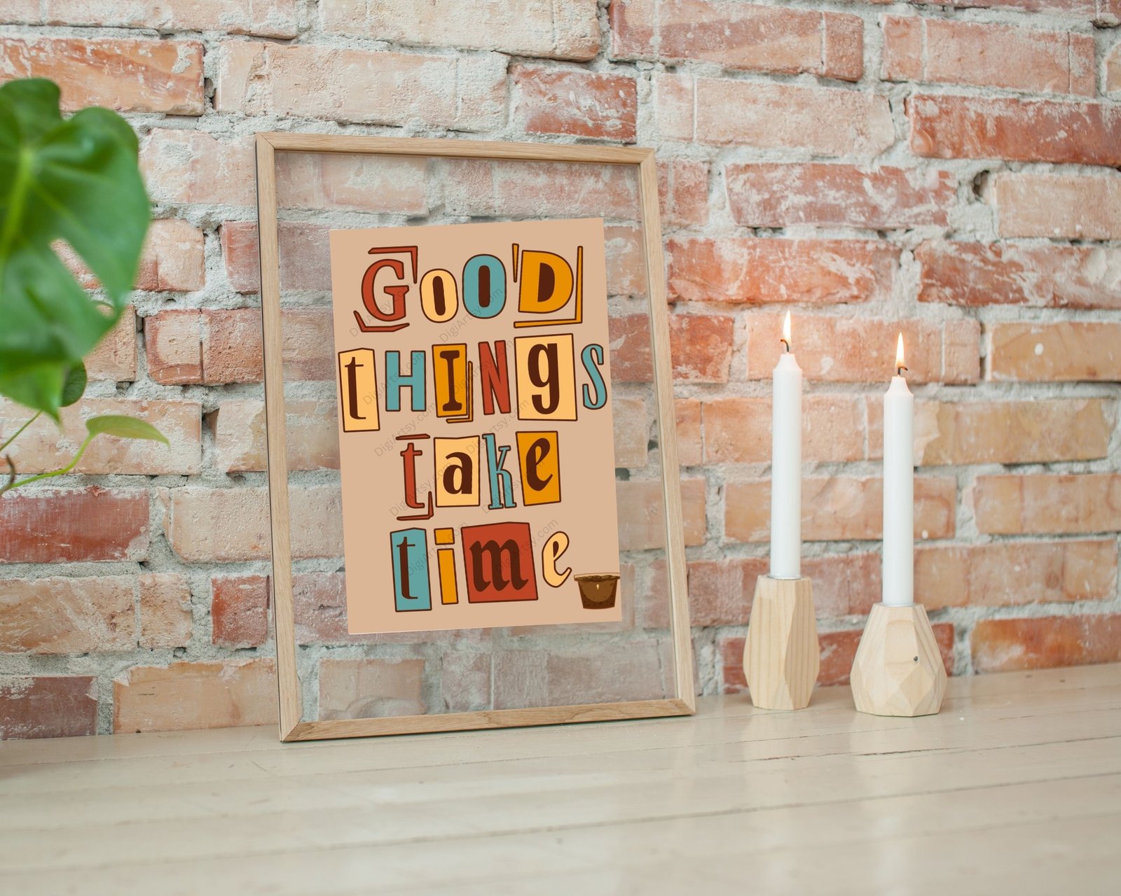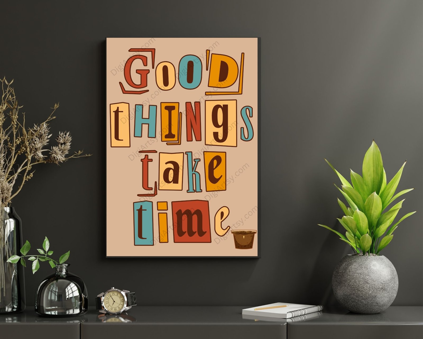 Inspire Entrepreneur Wall Art Motivational Posters with Brand New office Decor Word Typography Prints and Inspirational Quotes on Canvas. It is a motivational wall print with inspiring words such as ‘Good Things Take Time’ that will lift your mood up while uplifting the surroundings. This Motivation Wall Art is great in any room, as the motivation poster adds a little bit of positive and encouragement!