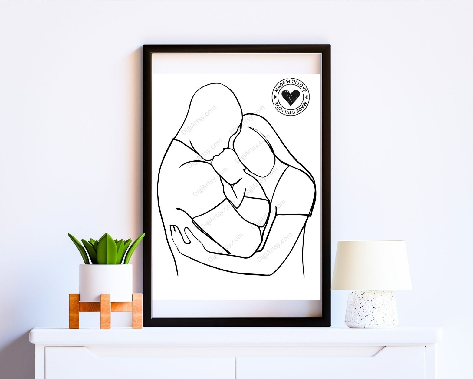 Celebrate the beauty of Family with this Made in Love Family Line Art Wall Decor featuring a line drawing of a mom and dad with infant. Perfect for adding a touch of warmth and elegance to any room, this printable Family wall art is designed in a simple yet sophisticated style. Ideal for modern or minimalist decor, this clean lines and gentle curves of this design will complement any space, from nurseries to living rooms.