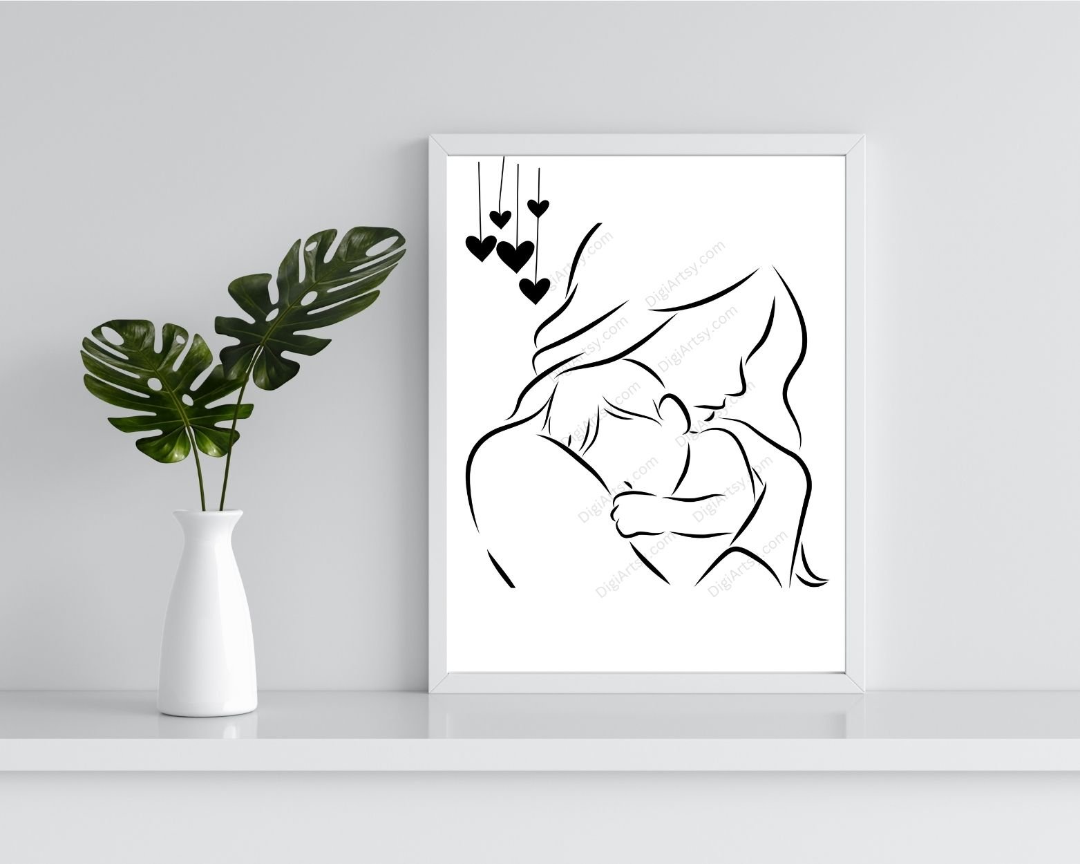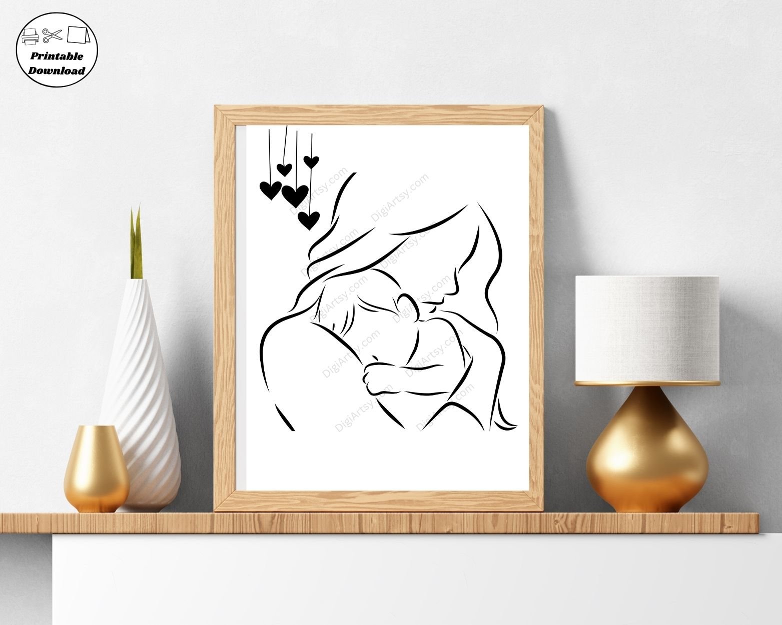 Celebrate the beauty of motherhood with this Mom and infant Line Art wall Decor featuring a tender moment between a mom and her baby with little hanging hearts. Perfect for adding a touch of warmth and elegance to any room, this printable wall art is designed in a simple yet sophisticated style. Ideal for modern or minimalist decor, the clean lines and gentle curves of this design will complement any space, from nurseries to living rooms.