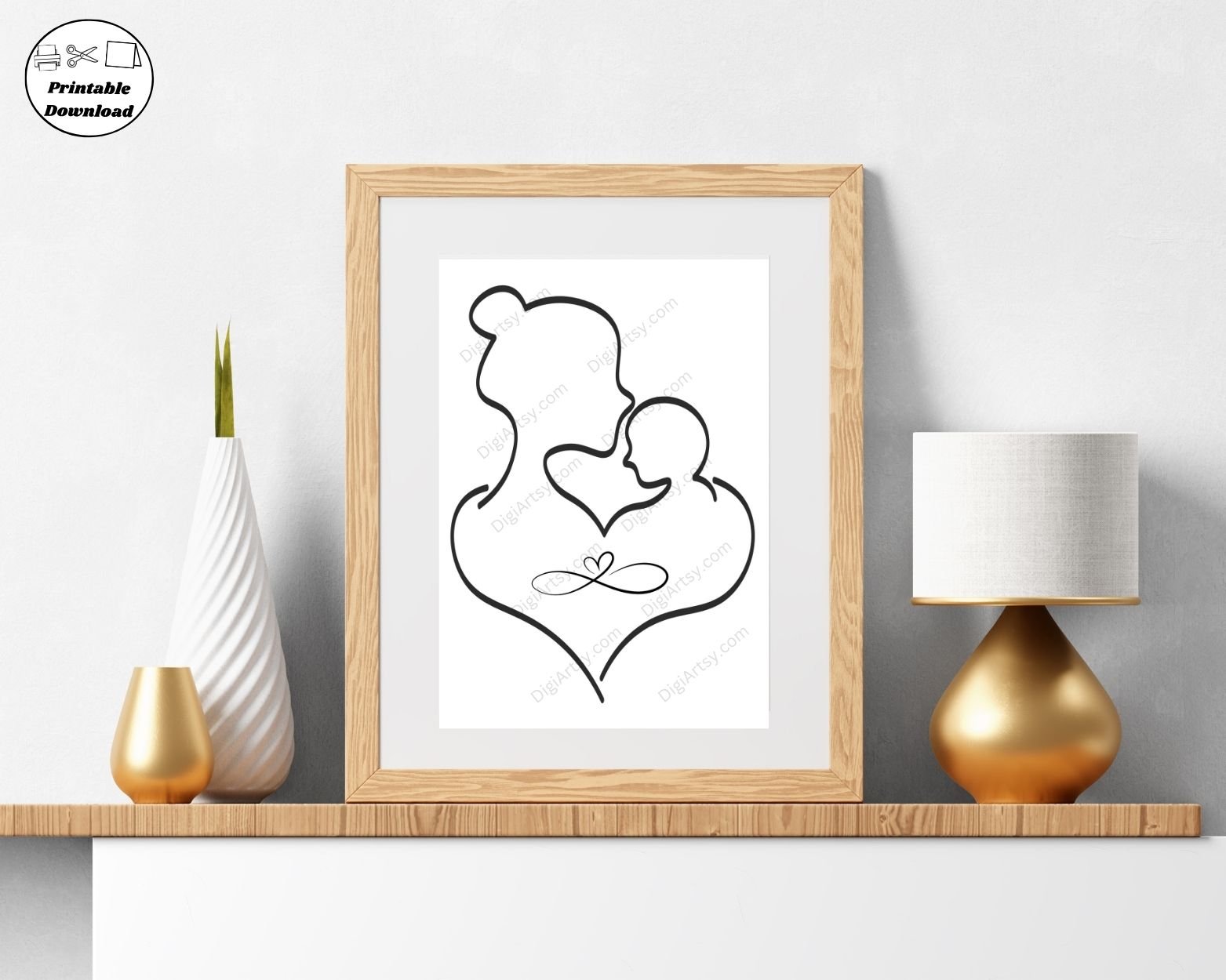 Celebrate the beauty of motherhood with this Mother and Baby Line Art in Heart featuring a tender moment between a mom and her baby in heart. Perfect for adding a touch of warmth and elegance to any room, this printable wall art is designed in a simple yet sophisticated style. Ideal for modern or minimalist decor, the clean lines and gentle curves of this design will complement any space, from nurseries to living rooms.