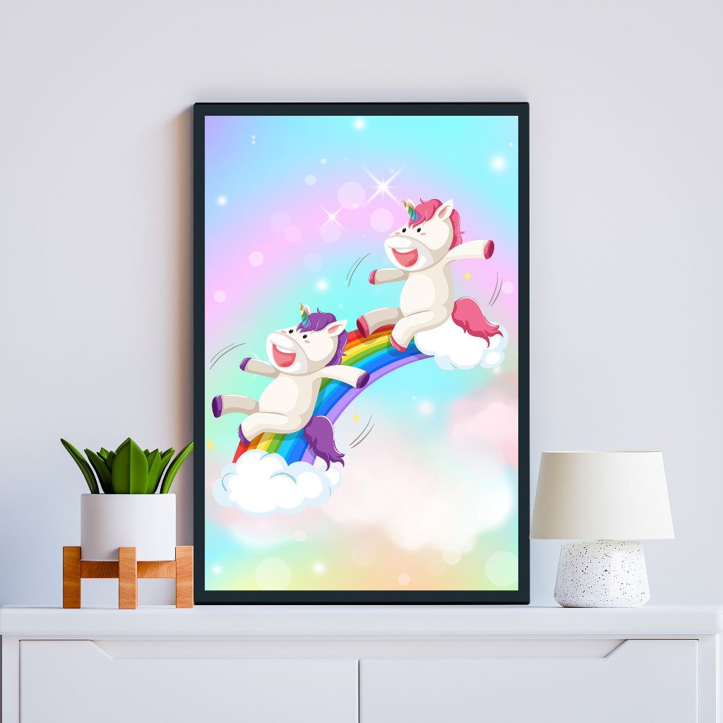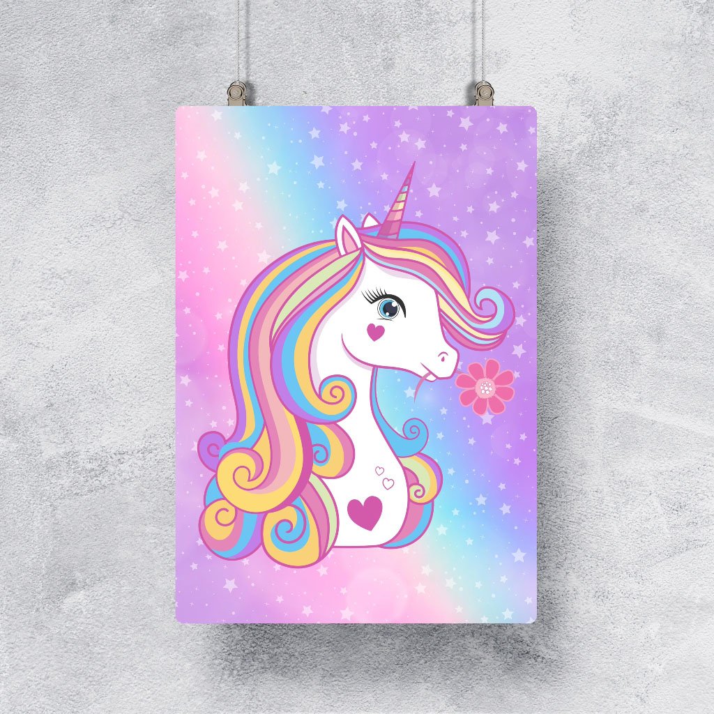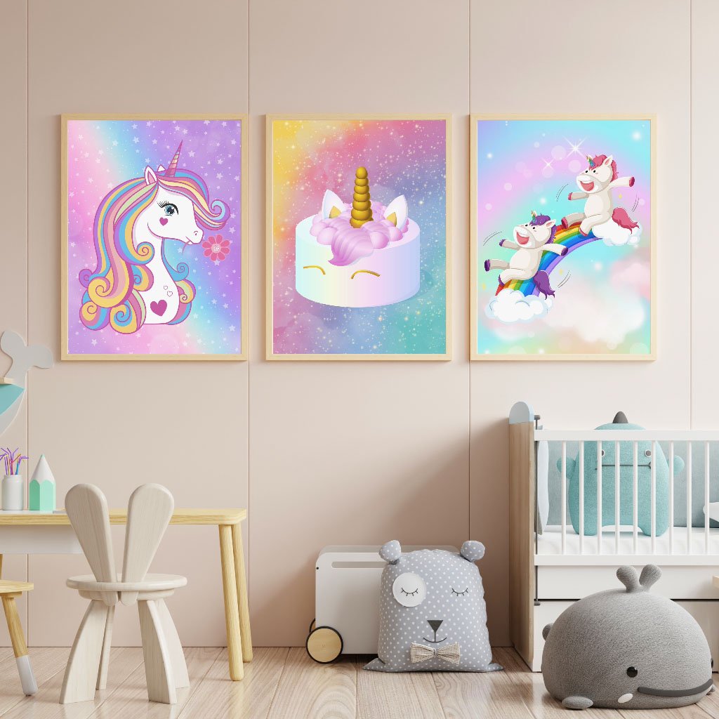 The Unique Unicorn Prints Set to brighten up a little girls bedroom. This charming Girls Wall Art Decor would look gorgeous in a girls bedroom or baby girls nursery, It looks really pretty with a unicorn theme bedroom. With a pink and purple color theme in mind, this would compliment multiple colour themes.