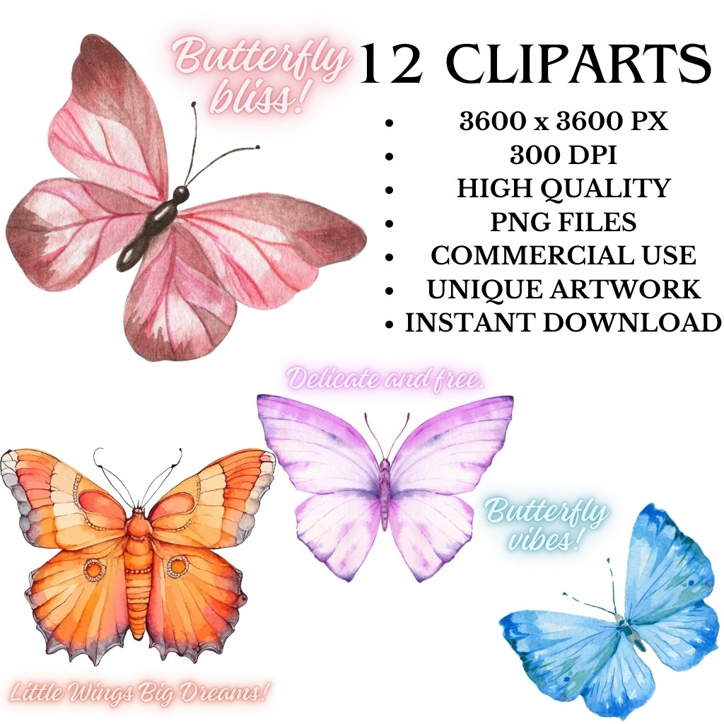 Watercolor butterfly clipart is perfect for card making, scrapbooking, T-shirt print, wall art print and many more. This digital butterfly quotes clip art pack contains 12 images of watercolor butterflies. Each butterfly is in PNG format (300 dpi resolution) with transparent backgrounds.